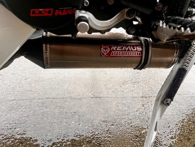 Brembo brakes front and rear, WP Suspension, Marchesini wheels, KTM Factory axle bungs, adjustable brake and clutch levers. Last, but not least, a great sounding Remus low mount exhaust. Has a couple scratches typical of a bike of this age.